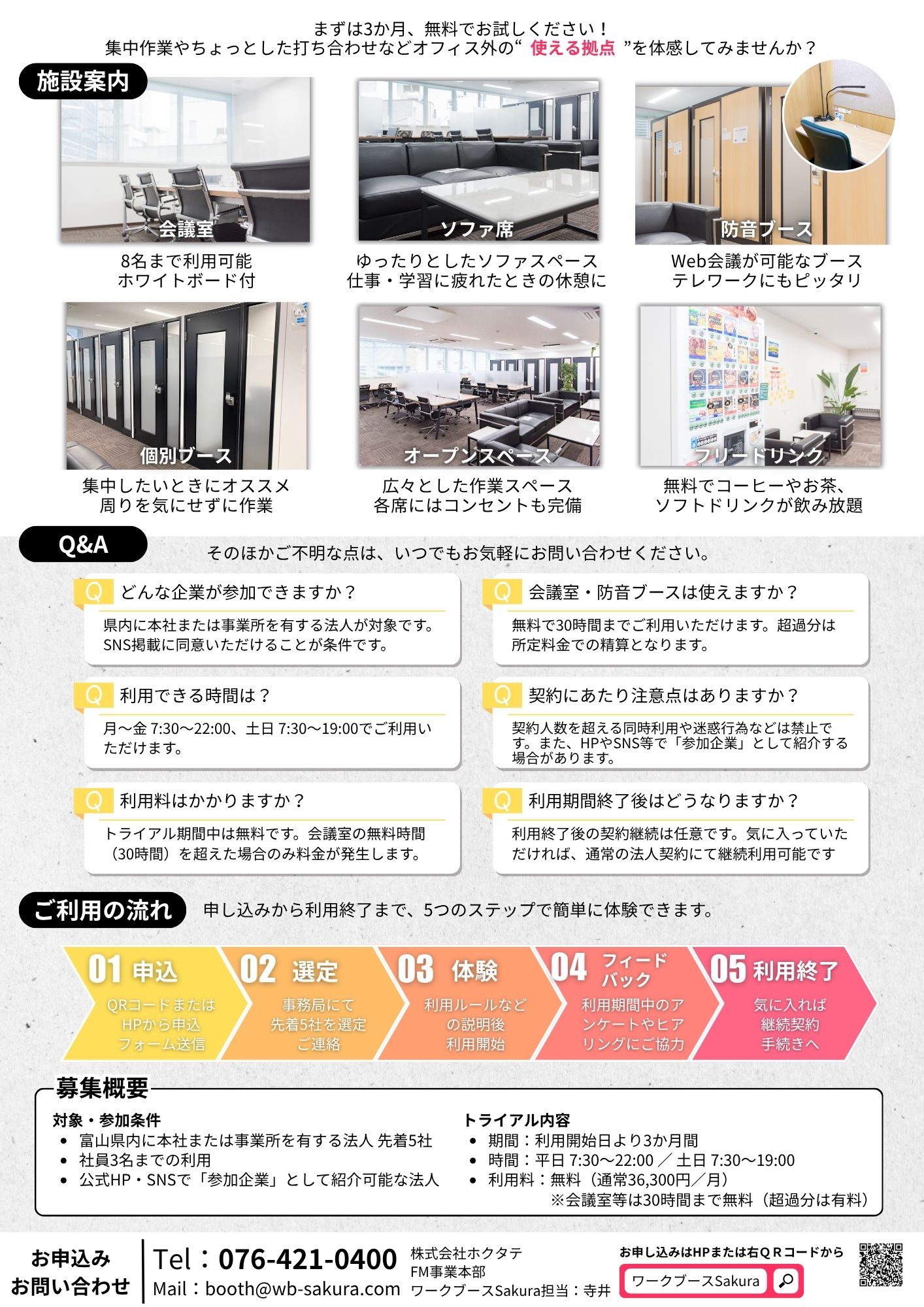 ワークブース Sakuraでは、富山県内の企業様向けにコワーキングスペースの「法人3ヶ月トライアル」を実施いたします。